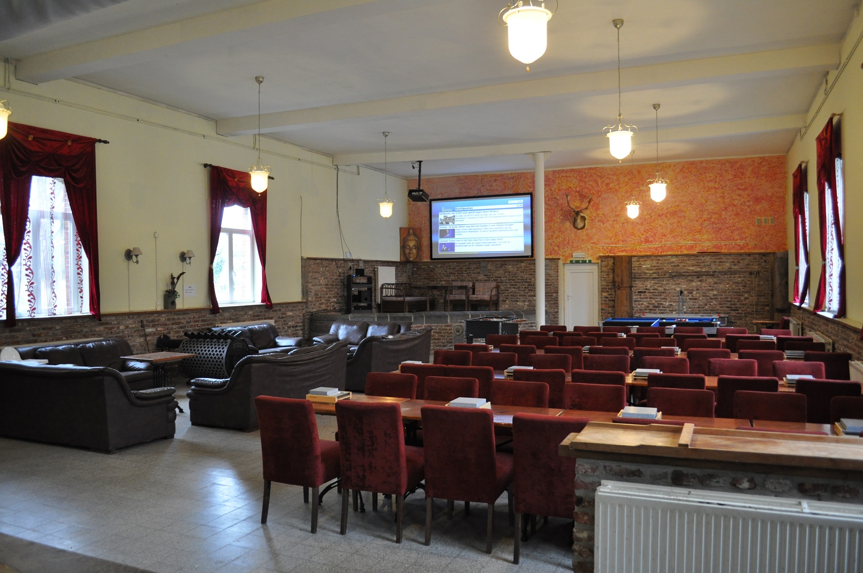 Feestzaal/ontspanningszaal van 200m2, met grote kachel, en beamer met groot scherm en home cinema systeem